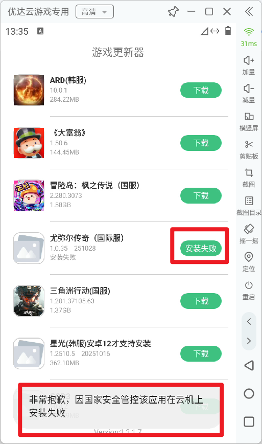 问题解答:安装尤弥尔必须使用【尤弥尔PRO】或【尤弥尔旗舰】定制版,如若提示【安装失败】,请联系app内在线客服更换为定制版,后续添加云手机请购买定制版!